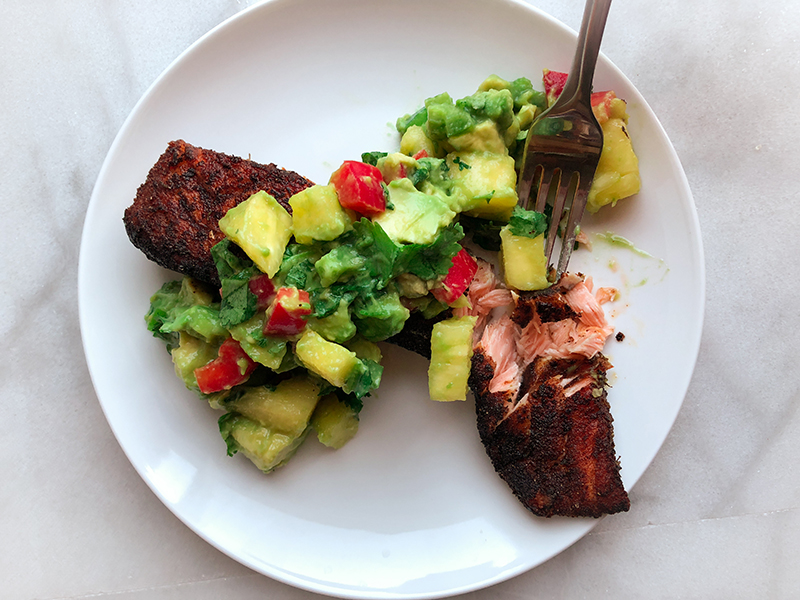 This blackened salmon brings a huge punch of flavor and the entire meal comes together in under 30 minutes. It’s sweet and spicy from the blackening spice, with an acidic and creamy fruit salsa to tame the fire. This recipe paired with the fruit salsa is so good, you guys. I make it for just…